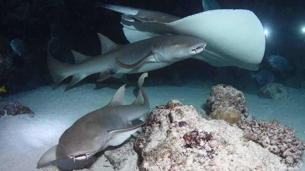 Competing with the tawny nurse sharks for scraps of food are the occasional whitetip reef shark, blacktip reef shark and dozens of Jenkin’s whiprays. These stingrays show no fear and clamber over each other, and the sharks and divers, to grab food. Also fighting for scraps are numerous trevally and snappers. The action at Alimatha Faru is unbelievable and matched by few night dives anywhere in the world.