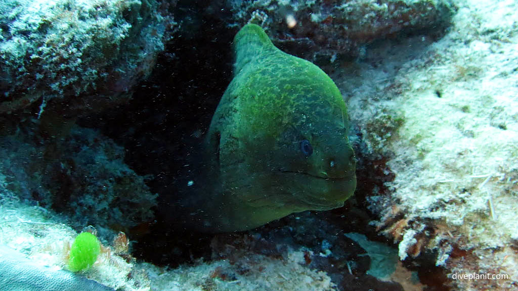 A giant moray hiding in the little holes in the rocks at Blue Pools.