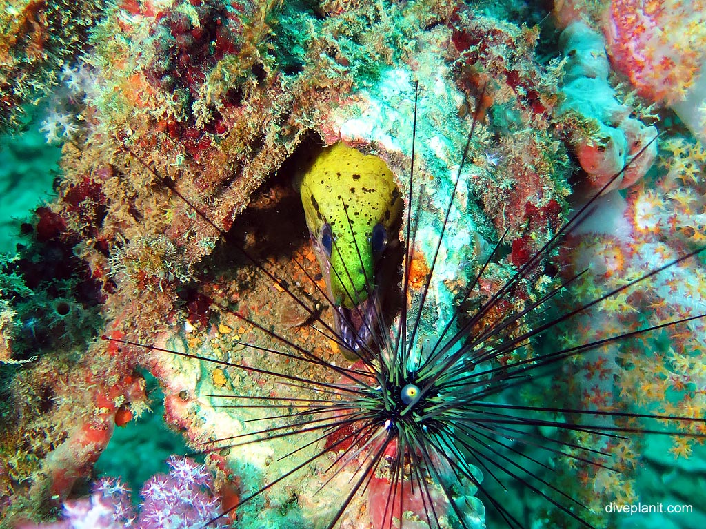 Down on the deck in a more sheltered spot, you’ll find Lionfish floating in corners and in the pipework look for eels – like this fimbriated moray.