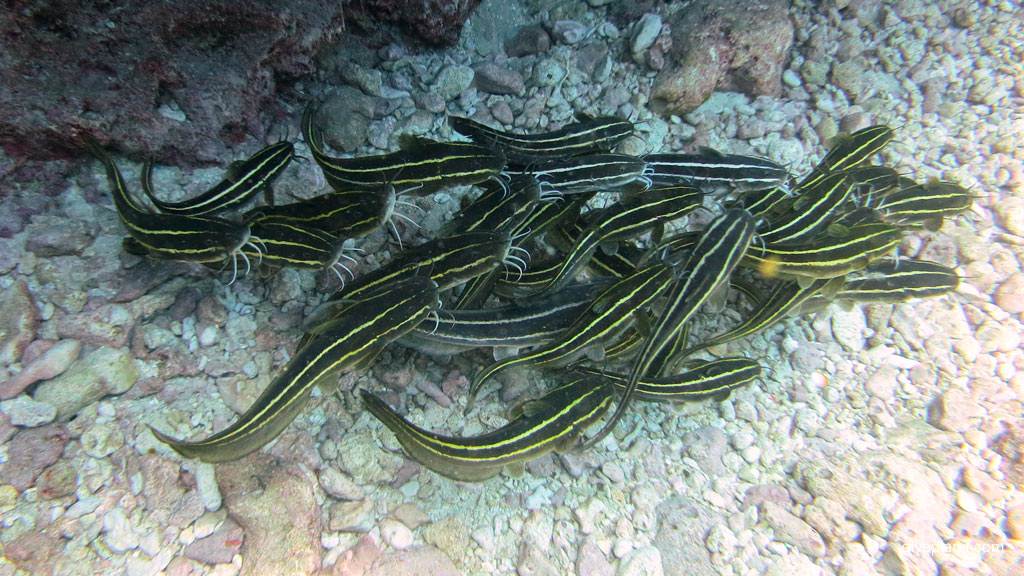 There are some fun swim-throughs, and lots to see under the over hangs. You can’t miss this writhing mass of lined catfish.