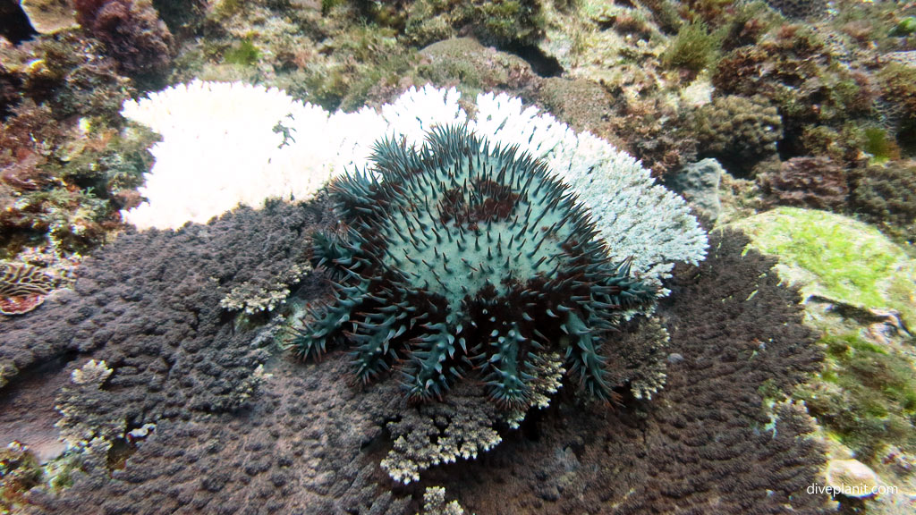 One critter you might also find, though often very unwelcome, is the Crown of Thorns starfish. It feeds on the polyps which are the living part of the coral reef. Behind this one you can see what is called the ‘feeding scar’, where the limestone coral skeleton has been stripped bare of its living polyps.
