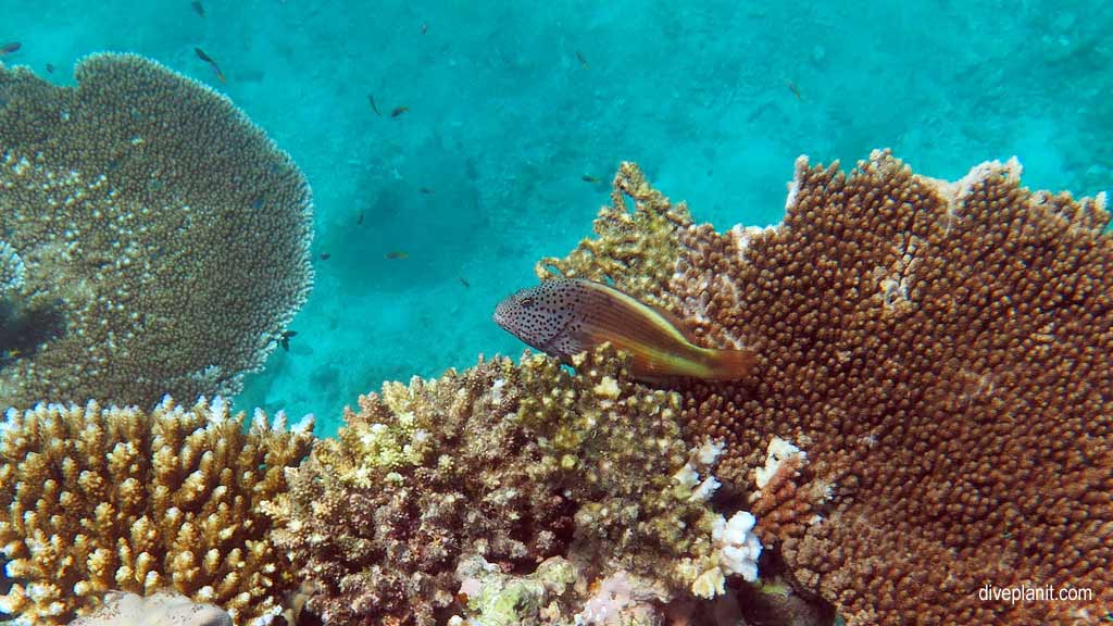 On top of the coral is a fish both easy to photograph and identify: the hawkfish lies still looking about for a passing nibble. Look around whilst you’re doing the safety stop.