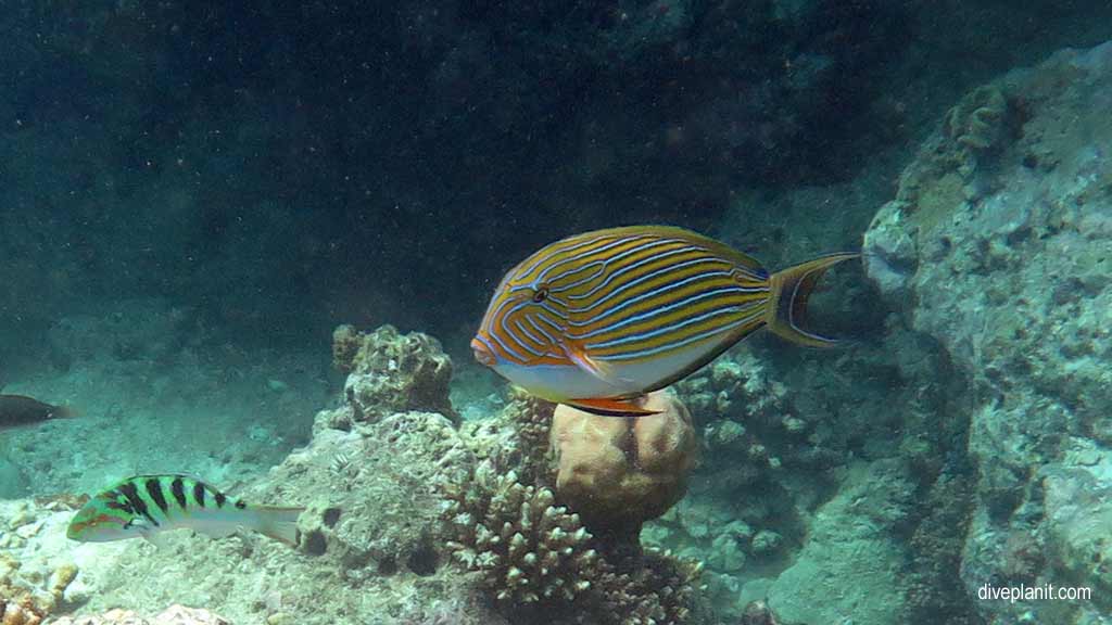 Another fish with a memorable name on this site at Plate Top is the Lined Surgeon (captured here with a six bar wrasse behind him).