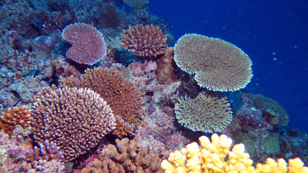 The Three Bommies are literally just that: three conical bommies, with flattish tops adorned with hard and soft corals, a few bright red sea fans down the bottom, anemones complete with clownfish dotted about and topped out with colourful heads of acropora in great condition. They are very close to Castaway Island and a local favourite of Castaway Diving.