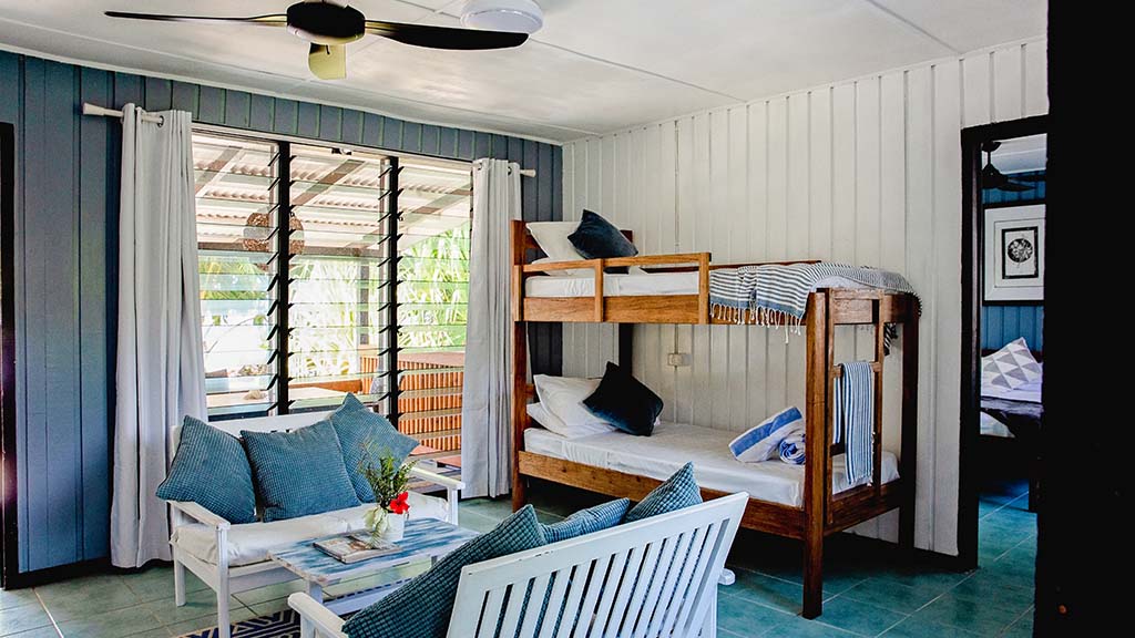 Recently renovated, these larger rooms include two separate sleeping areas—one with a queen bed and the other with bunk beds. French doors open onto a spacious verandah overlooking the ocean, offering a practical option for families.